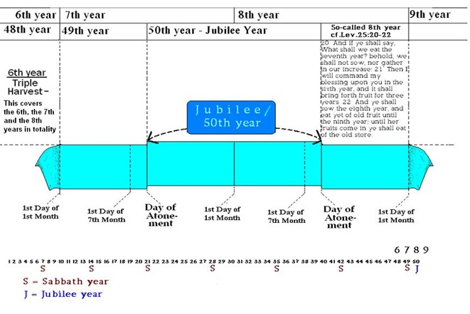 A treble harvest is granted at the Forty-eighth year of the Jubilee in the sixth year of the last cycle so that the two years of the Sabbath and the Jubilee can be kept (Lev. 25:21). This Jubilee year is counted from Atonement on the Forty-ninth year to Atonement in the Fiftieth year or Jubilee, when all lands return to the tribal possessors. All land values are calculated from this basis (Lev. 25:15). This year is kept and the Jubilee blown at Atonement in year forty-nine (Lev. 25:8-9), and then kept holy for one year to Atonement on the Fiftieth year (Lev. 25:9-13), so that the lands can then be ploughed and sown for the spring harvest in Abib of the First year of the next Jubilee. This year (50th) is an eighth normal year of the cycle (Lev. 25:22).
